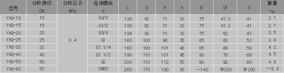 通径DN10~50为螺纹连接,DN80为法兰连接。公称压力为0.4MPa