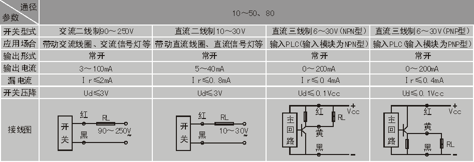 3、输出形式如需常闭或输出电流有特殊要求在订货时应注明;若不注明接近开关型式,则配置PNP型直流三线型。